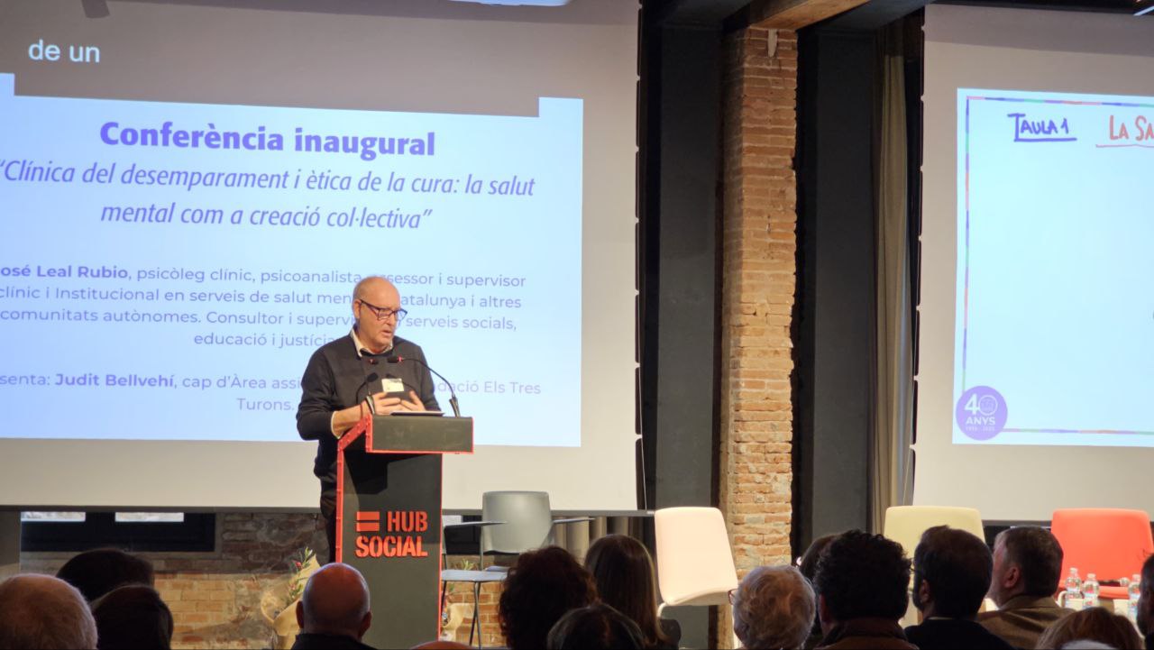La intervenció de José Leal Rubio, psicòleg clínic, psicoanalista, assessor i supervisor clínic i Institucional en serveis de salut mental, presentada per Judit Bellvehí, cap d’Àrea assistencial de la Fundació, va fer una invitació a mirar de cara les zones fosques sobre les quals s’ha construït el sistema de cures.