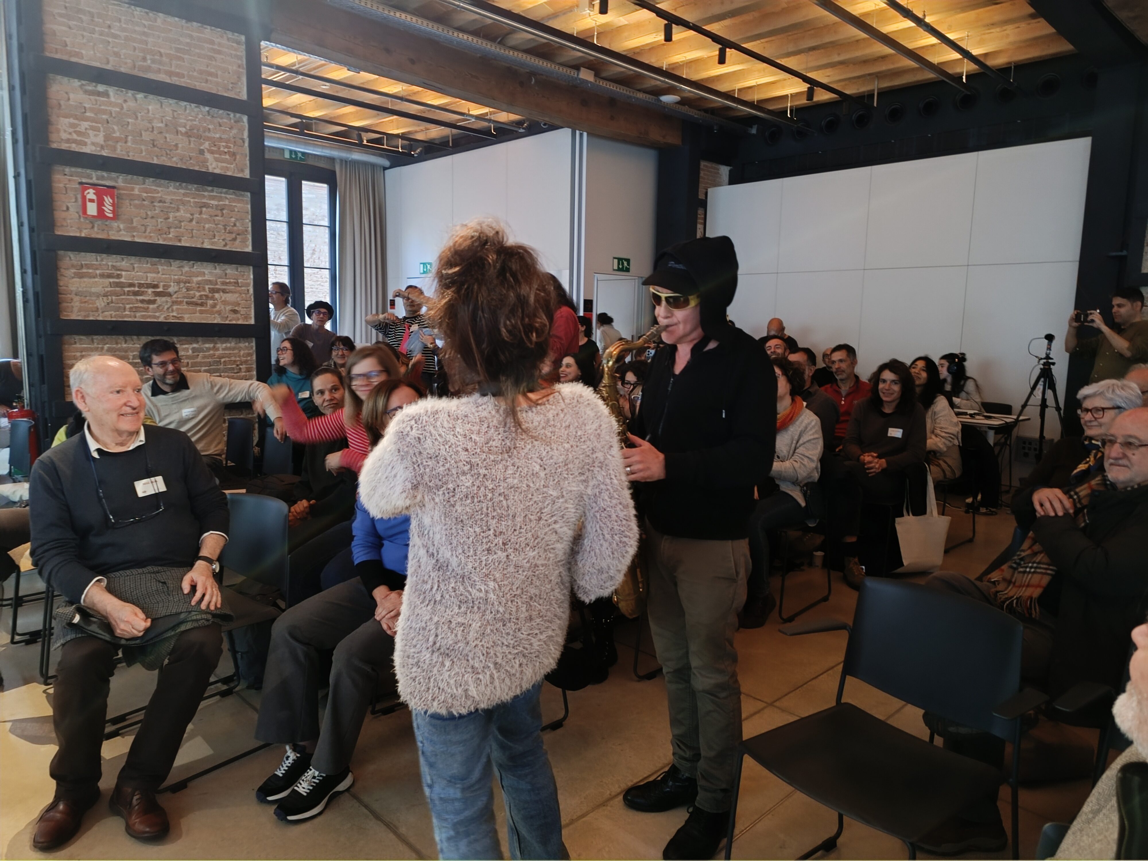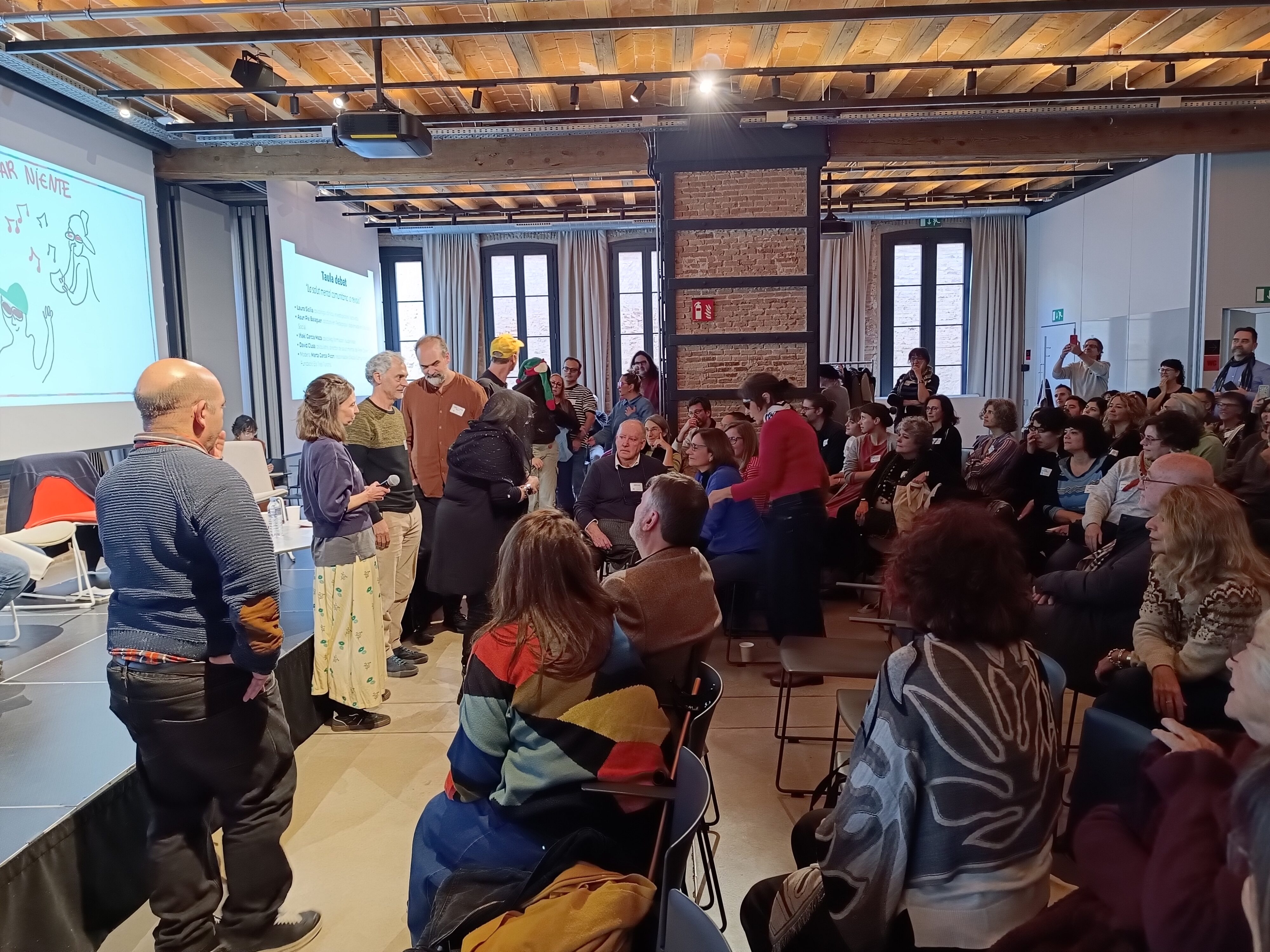 La taula va tancar-se amb una intervenció sorpresa de Teatro de Pacotilla. Cantant i ballant, van aixecar tothom de la cadira amb una acció que recordava que la comunitat també es construeix amb alegria, complicitat i cos.