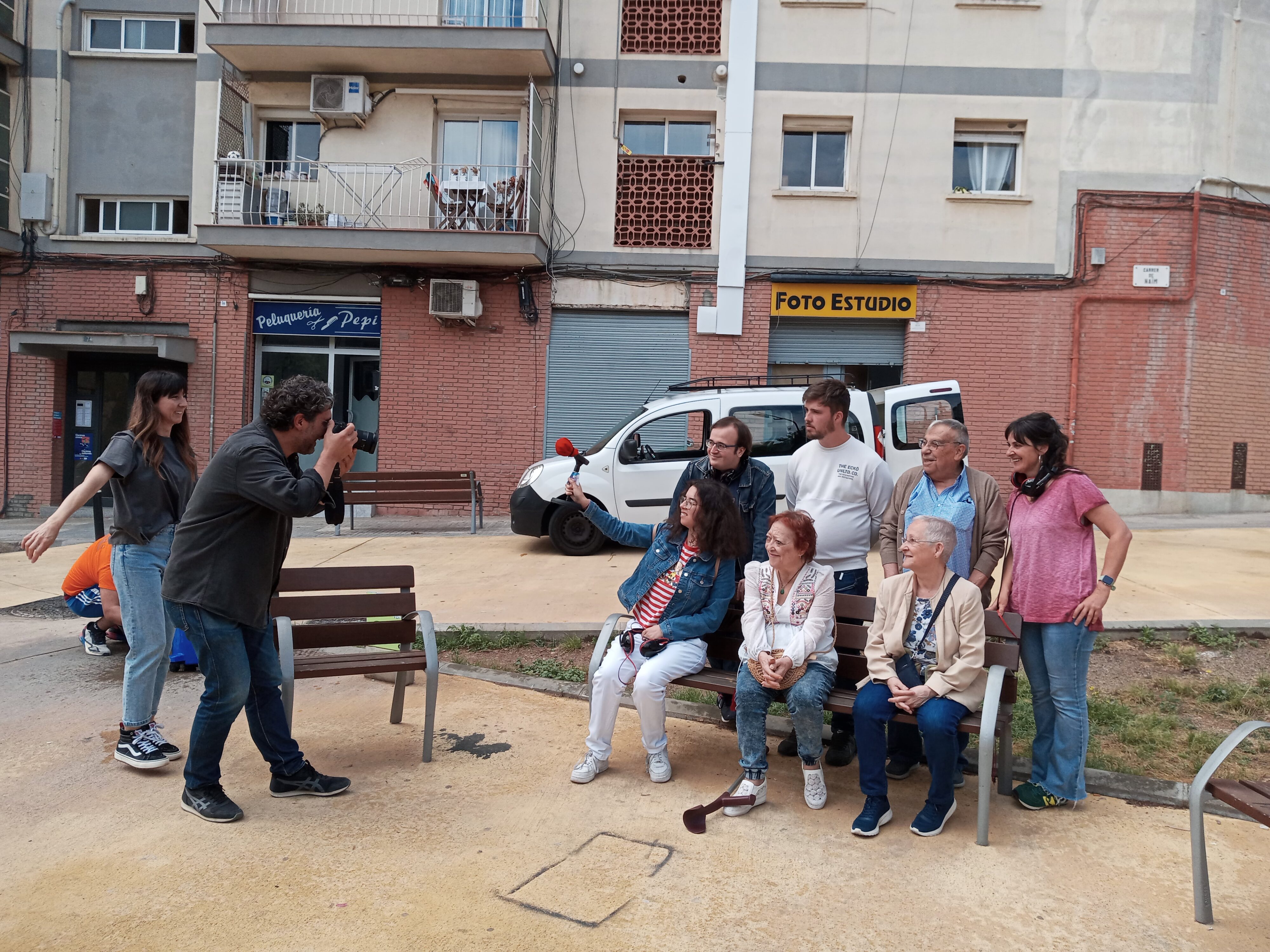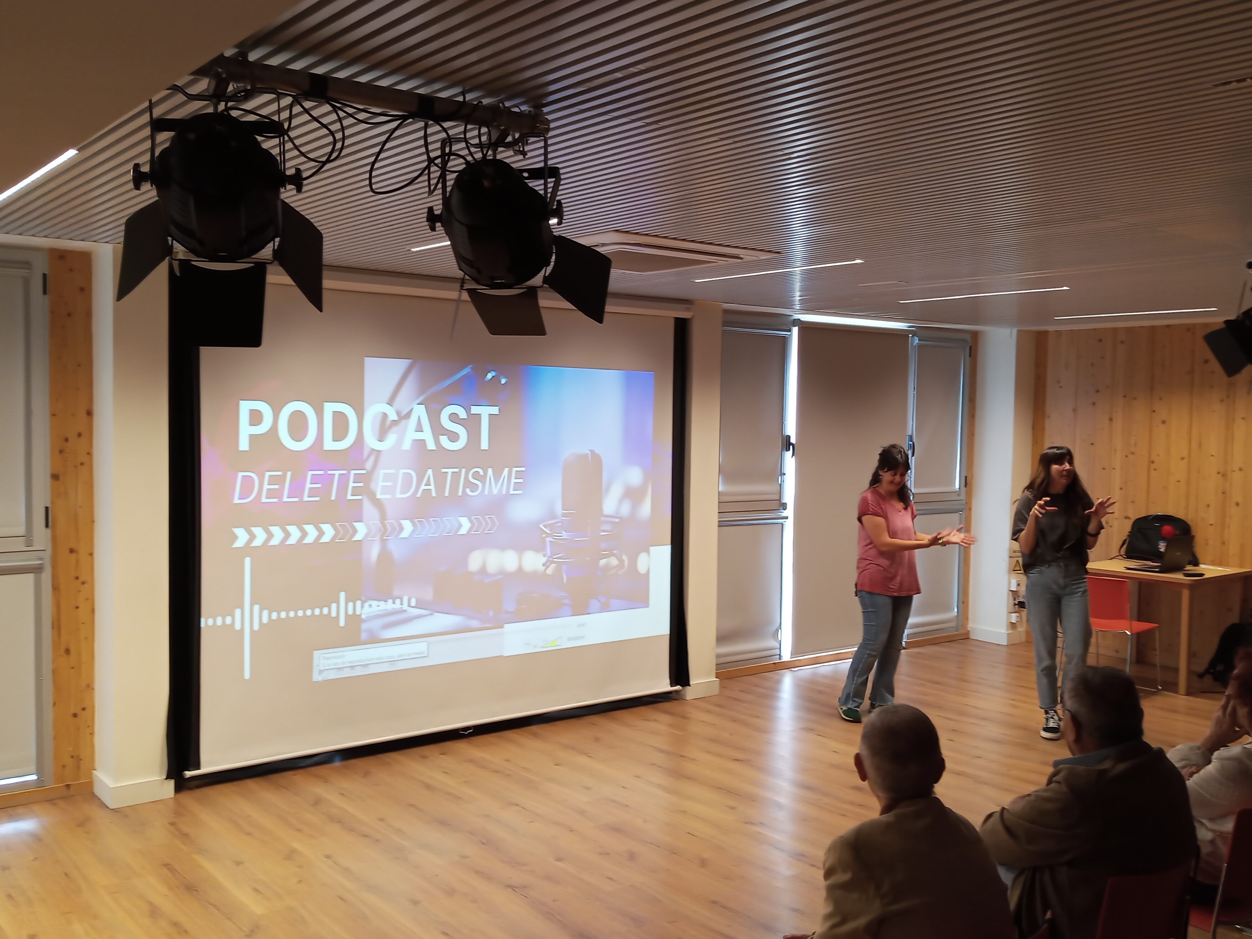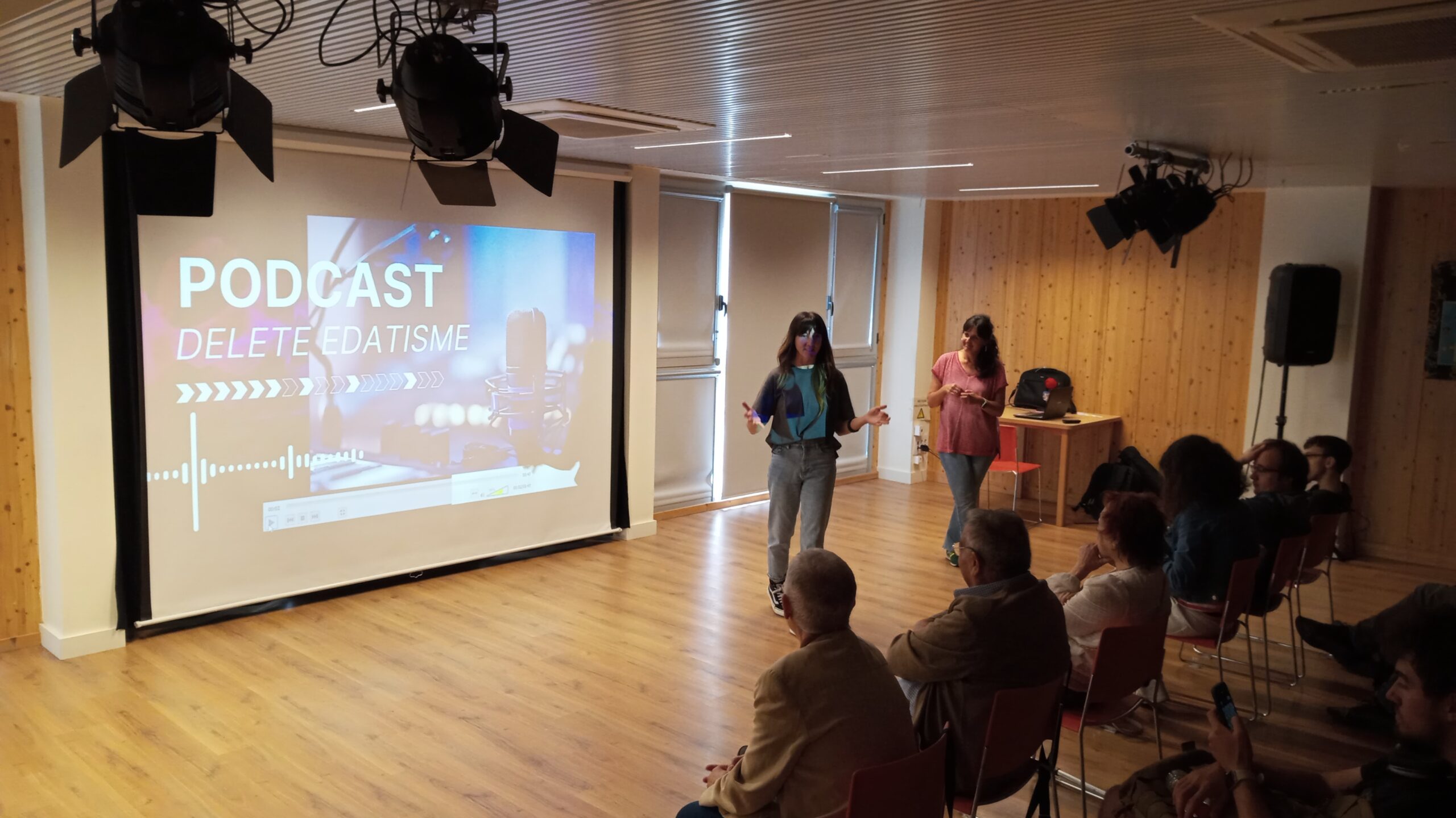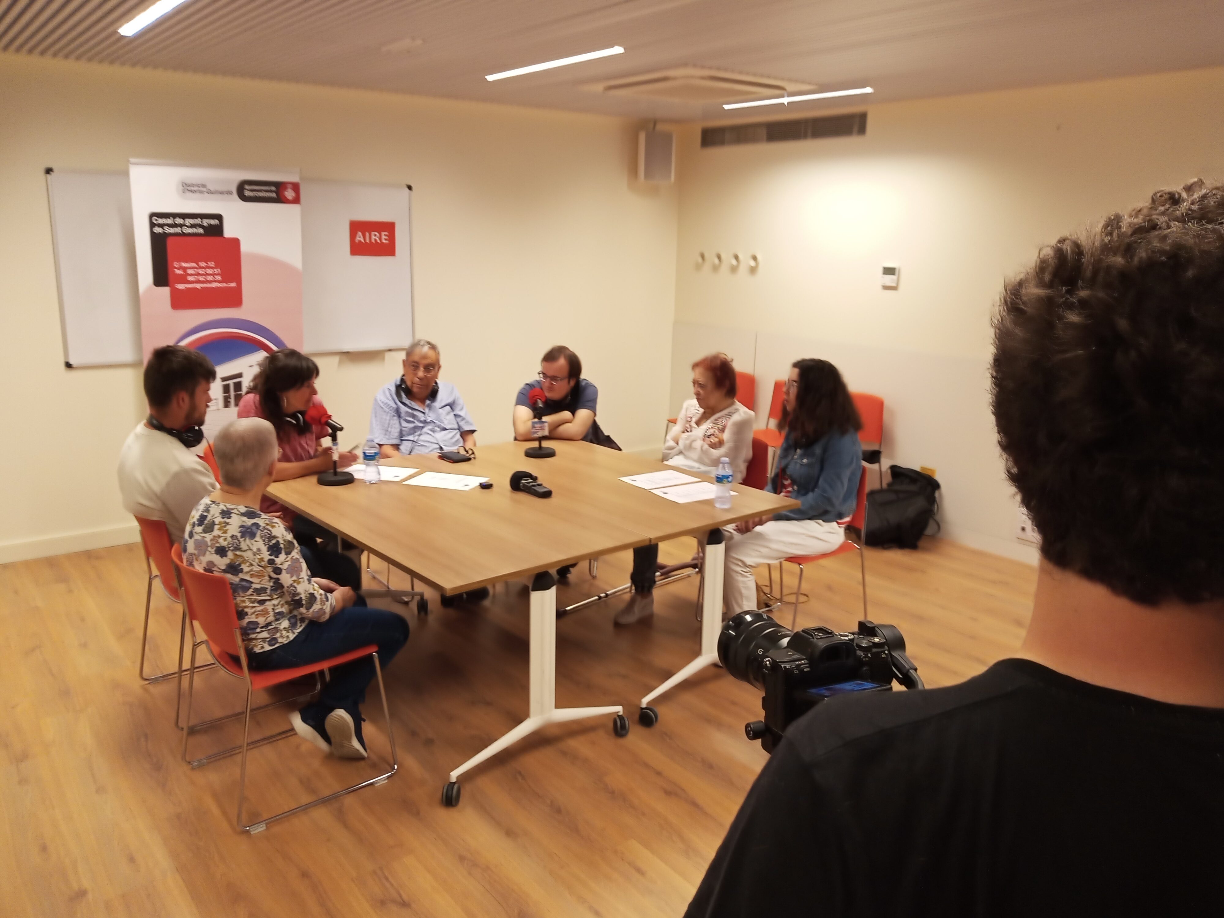 En una sala d’actes a les fosques, la llum d’un projector va mostrar la sala de ràdio de l’A.V. amb una taula rodona, micros i parelles de tertulians, la meitat joves de WeLab i l’altra, participants al Casal de Gent Gran. Rere les càmeres, fora del focus, l’altra part de WeLab va filmar un diàleg intergeneracional conduït per La Tere, de l’equip de professionals del Casal.