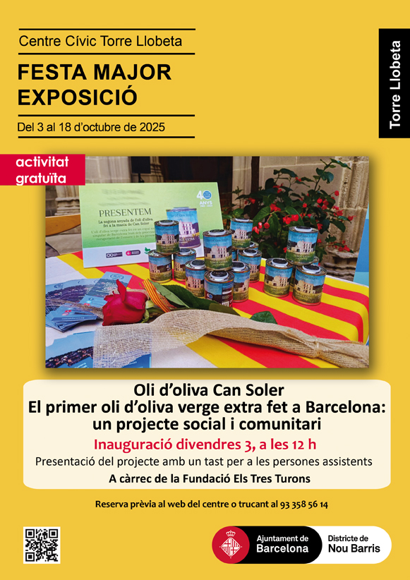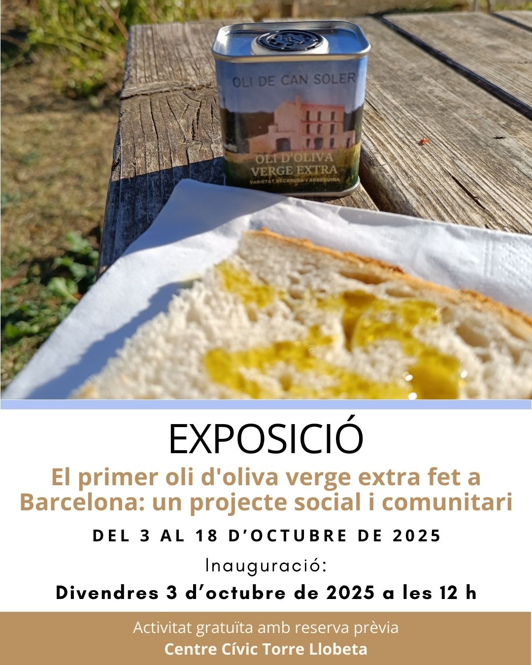 Del 3 al 18 d’octubre de 2025, el Centre Cívic Torre Llobeta acollirà l’exposició “El primer oli d’oliva verge extra fet a Barcelona: un projecte social i comunitari”.